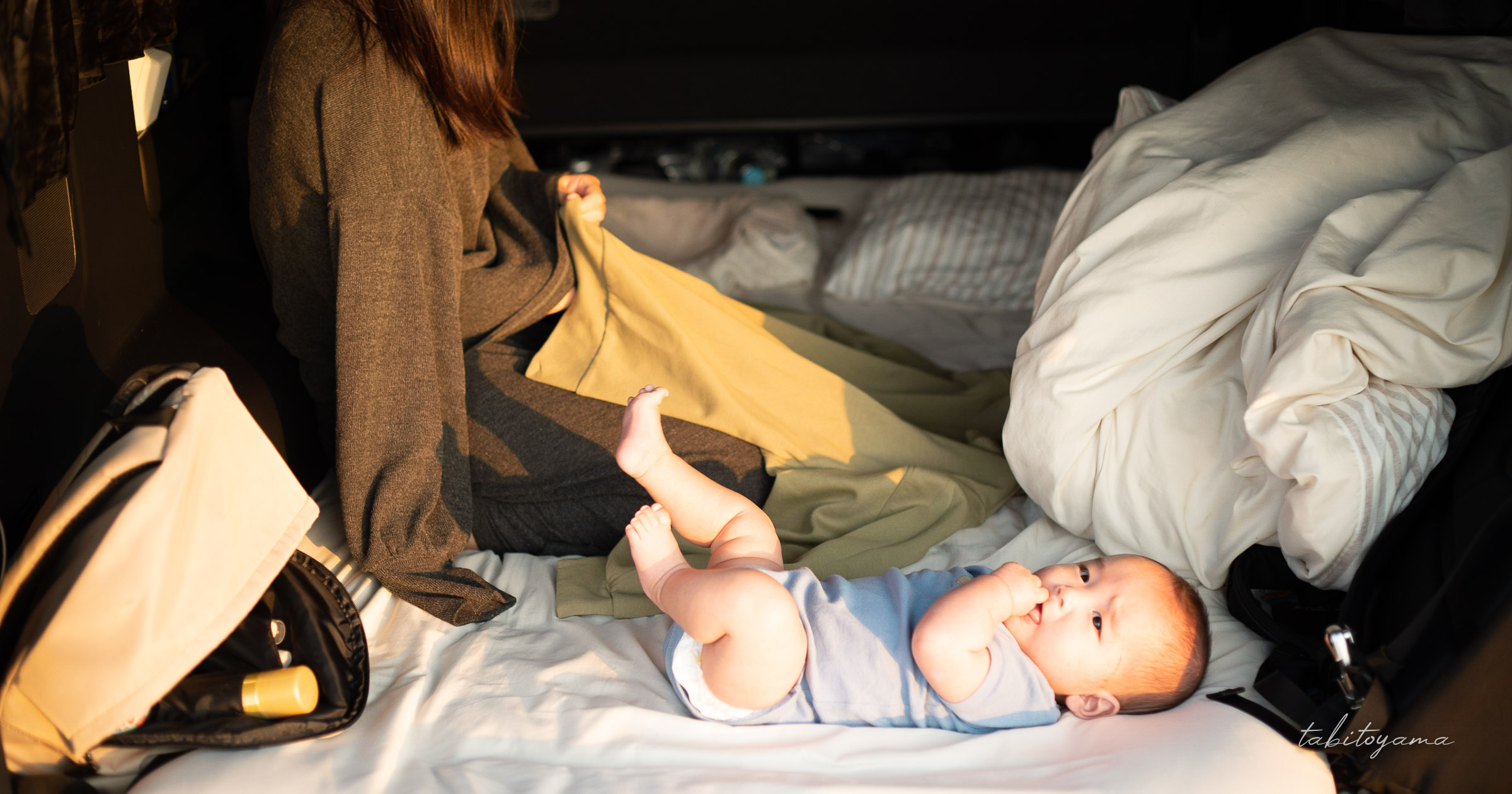 旅の途中、サービスエリアで離乳食を食べる息子の姿も、この旅の大切な風景のひとつだ。