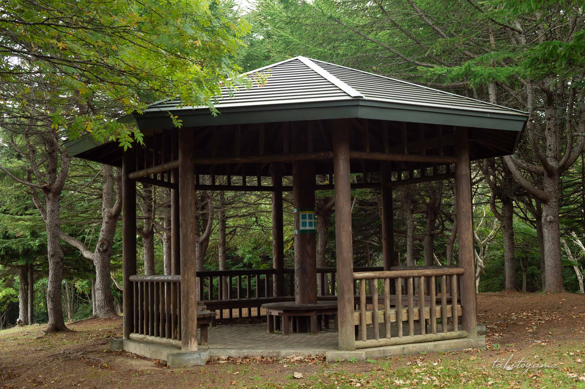 林間サイト奥にはとても大きな東屋もあります。この周辺の芝生は日当たりも良く、設営スペースも広いのでグループで集まるには最適です。