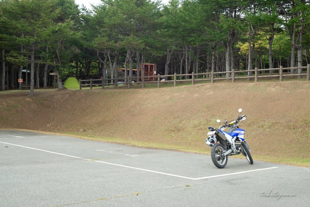 ライダーにとってありがたいのが、このバイク専用の駐輪スペース。観光地の駐車場ではたまに見かけますが、無料キャンプ場で整備されてるのは珍しい。
