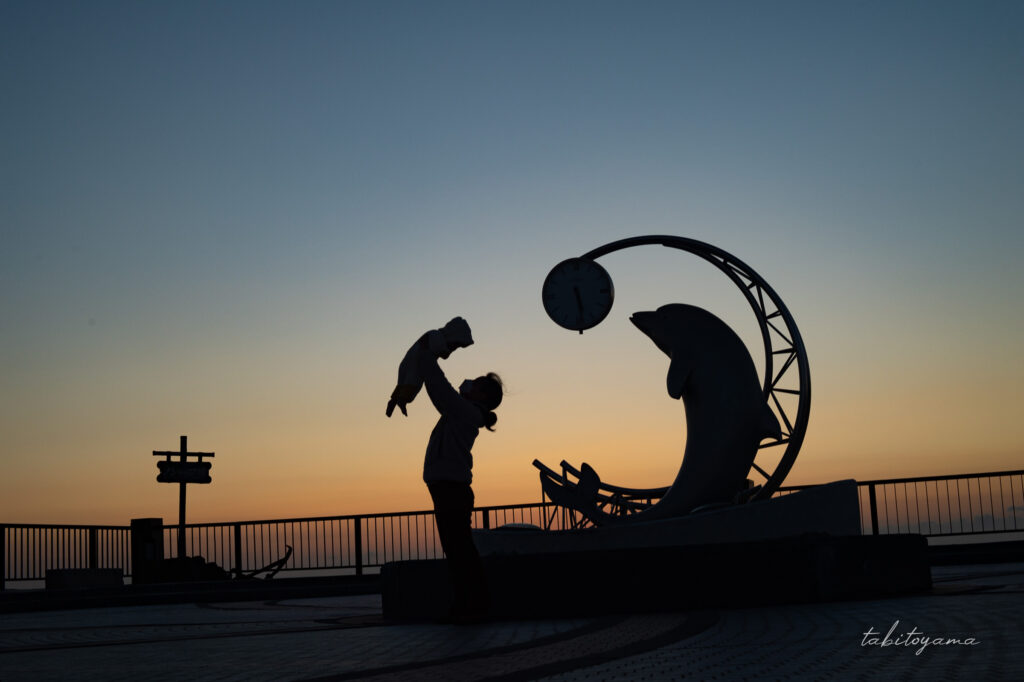 日本全国でも有数の美しい夕陽が見られる場所で、イルカのモニュメントと美しいシルエット写真が撮れる場所です。ここで撮影した家族写真は、今でもお気に入り写真の一枚です。